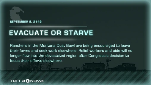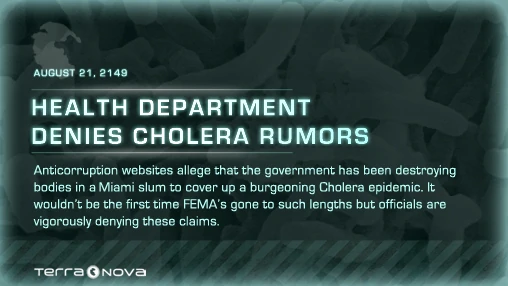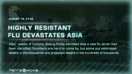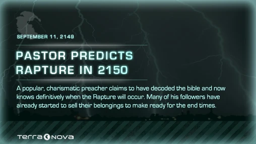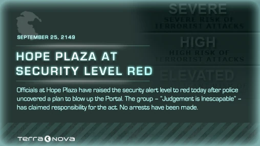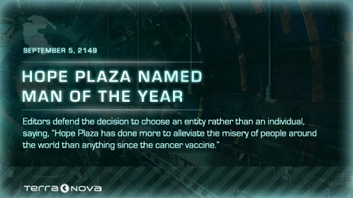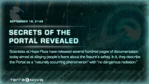Before Season 1 of Terra Nova was released, the Countdown to Terra Nova app revealed a teaser video, poster or faux news article every day until the premiere. The app was created by the Cargo Collective under the supervision of Anna McClure.[1]