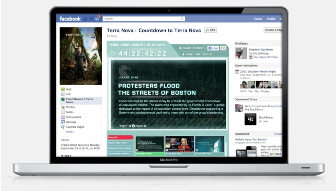 The Countdown app was available on Facebook and the website assets.fox.com/shows/terranova/. The top of the widget had a counter that informed the viewer how many days:hours:minutes:seconds were left before the show's premiere. The top also had a few like buttons.