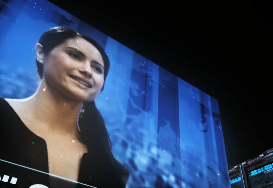 The newscaster on a screen in the Hope Plaza station