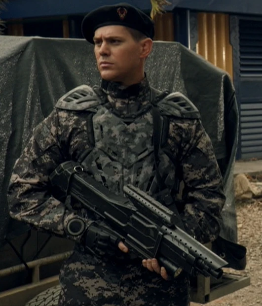 When Casey Durwin was offering a distraction to a convoy on its way outside the colony by faking damage to his wheelchair, Malcolm Wallace yelled at the guards for not helping Durwin and this soldier told him to back off. ("Occupation")